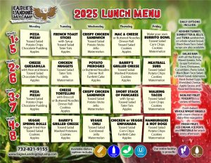 Eagle’s Landing provides a hot, nutritious lunch program for all campers. We provide a tasty menu that rotates throughout the summer. A hot entree is available every day and includes healthy, kid-friendly foods.